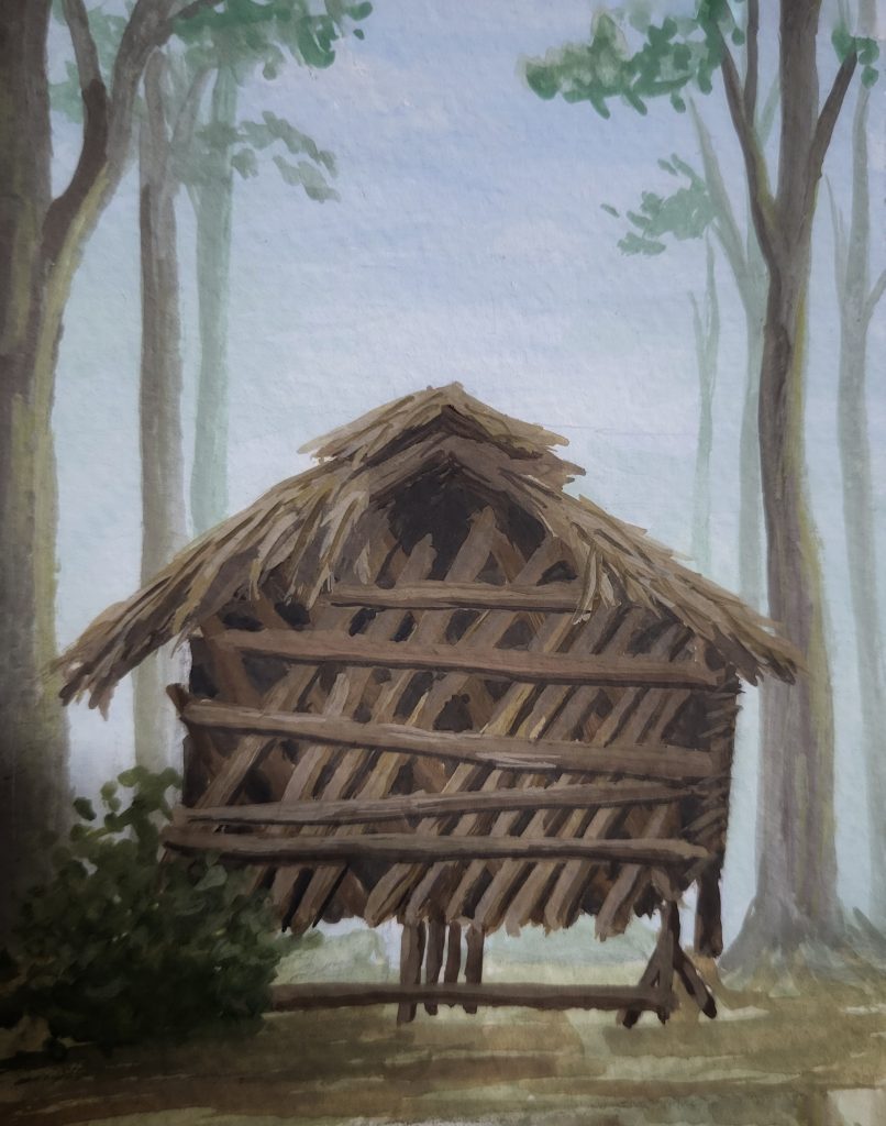 The houses in the villages were typically constructed from wood or bamboo, with roofs made from palm thatch or tin. Churches were often the only cement structures. However, in Peshu village, we observed that stone slates were used for roofing, a typical feature of traditional Khiamniungan homes. The granaries in the villages were built in a similar style to the houses, mostly situated a short distance away from the main dwellings. They are lifted from the ground with poles to protect the grains from rodents and insects.