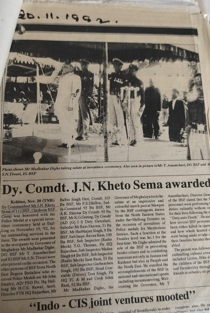 Historically, the Nagas have faced challenges in economic development and lacked adequate educational institutions. Many individuals who joined the BSF had only completed primary education. However, the BSF offered them an opportunity to become literate, enabling them to read and write and receive various prestigious awards. In one of the interviews, the wife of a BSF soldier told me that in the past, her husband read Hindi novels and wrote poems in Hindi. Another wife added, ‘Kikhevi studied only Class B. But his knowledge is equivalent to Matric’. Similarly, numerous BSF soldiers received awards for their accomplishments and recognition for their outstanding contributions to the nation. Brave service members who displayed extraordinary courage in the line of duty received the Sena Medal, a police medal, one of the most prestigious military decorations.