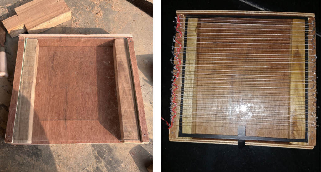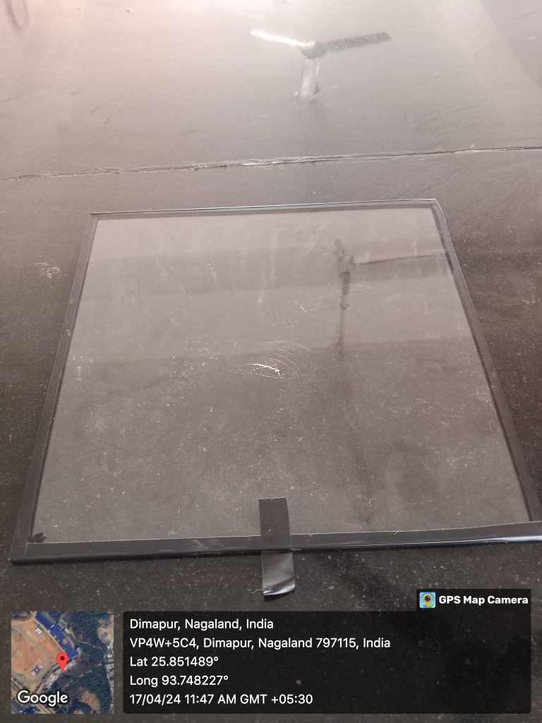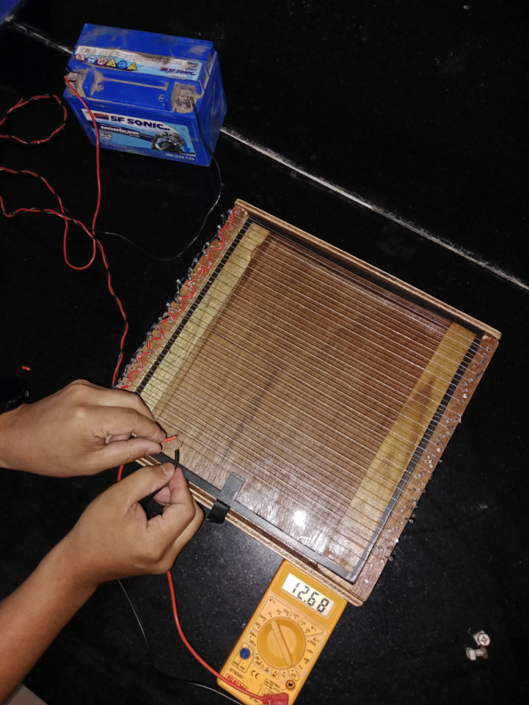 The venom collector was made using wood and plywood to construct the two borders and the base-end of the model, respectively. To create the open circuit arrangement, alternate positive and negative wires were laid parallel and approximately 5 mm from each other. A 12-volt battery was used to power the device. A glass pane was kept beneath the wires to collect the bee venom. When bees touched both the positive and negative wires simultaneously, they completed the circuit and enabled the current to flow. The flow of current tricks the bees, and they tend to sting on the glass pane, releasing their venom. The bees do not die in the process because their stings remain within their bodies.