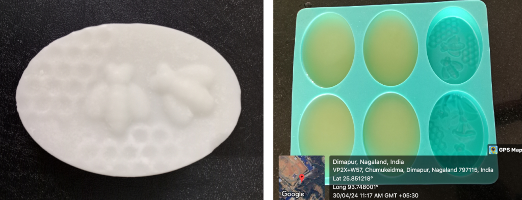 In my study, I used the cold process for soap-making. One of the advantages of this process is that it allows full control over the product, including the soap’s scent and appearance. The cold process begins with preparing a lye solution (sodium hydroxide) by mixing with water, to which oils (coconut oil 133 g and olive oil 67 g) are added. The oils must be carefully blended and once thoroughly mixed; additional ingredients such as bee venom (0.50 g in 260 ml of soap solution) or fragrances can then be added according to preference. The resulting solution is poured into moulds and left to cool and harden into a cake of soap. The pH of the soap is then measured after two weeks; a pH of 9.61 is ideal for skin.