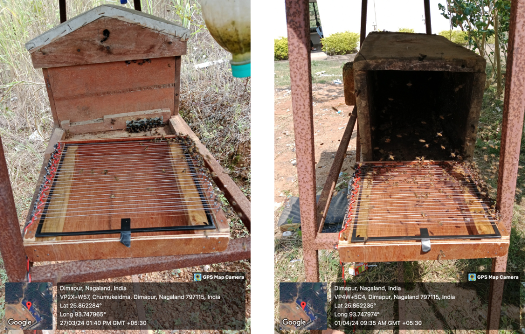I conducted the study at the apiary at St. Joseph University, Ikishe Village, Dimapur. Nagaland, India, where the Zoology Department rears honeybees for educational purposes only. The study area is rich in biodiversity, with many flowering plants and trees around the campus providing good nectar sources for the bees. The average temperature in Dimapur is 22.6°C, and the average annual rainfall is approximately 1710 mm. August is the hottest month of the year, with temperatures varying from 21.6°C to 32.7°C.