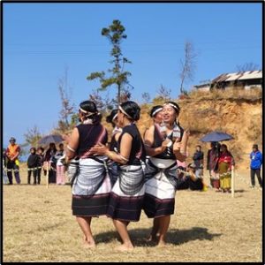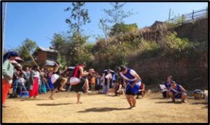 Khienuo Khiepuo involves teams of five or six forming a circle, facing outward. Each player folds one leg backward, locking their foot onto another’s leg to create a connected formation. While singing traditional songs, the teams spin in unison. The team that maintains the formation the longest wins.To play Etsü Lopa, women divide into teams, standing on either side of a line. The objective is to pull the opposing team across the line while singing a folk song, blending physical strength and agility with cultural expression.