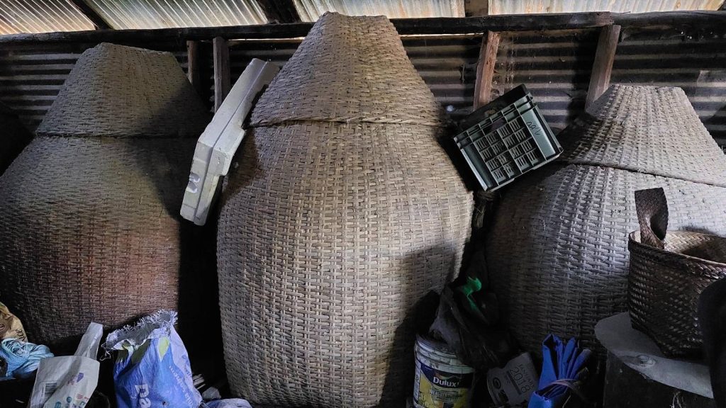 Walking through Zhavame, we could feel the echoes of a deep and enduring connection to village traditions. Many homes proudly display Feast of Merit horns, signifying past community feasts hosted by their owners. Inside, rice is stored in beautifully carved bamboo barns, and large wooden containers hold grains. Some homes still preserve dried meat from ceremonies held decades ago, serving as a testament to their rich traditions and a symbol of ancestral pride. At the home of a local researcher, we saw a piece of dried buffalo meat that had been preserved since his parents’ wedding over 30 years ago.